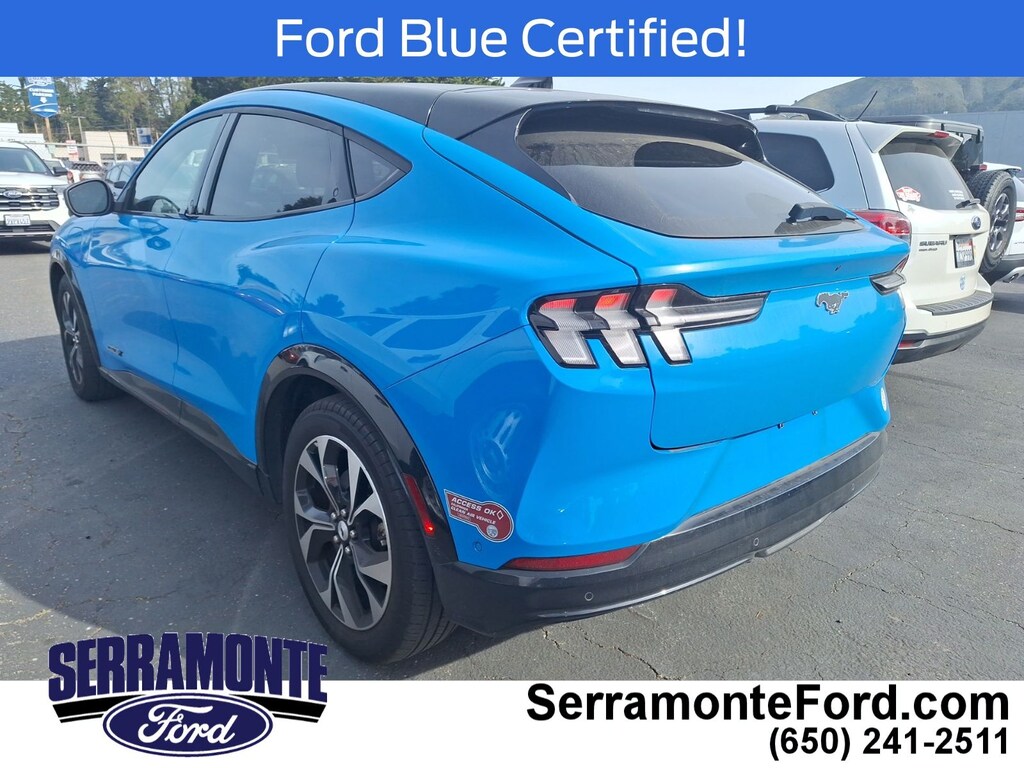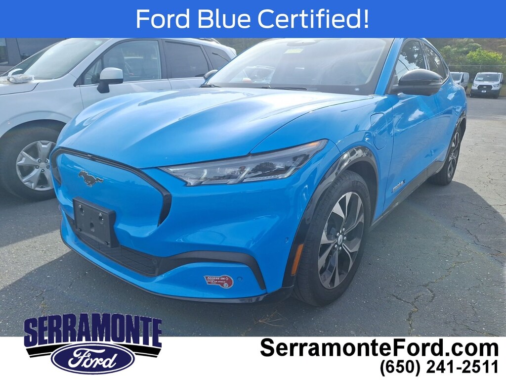 Recent Arrival! Certified. Clean CARFAX. ***ONE OWNER W/CLEAN CARFAX***, ***LOCAL TRADE***, ***BALANCE OF FACTORY WARRANTY***, ***BACKUP CAMERA & BLUETOOTH***, ***FRONT AND REAR PARK ASSIST***, ***LANE-KEEPING SYS./ALERT***, ***POWER FRONT SEATS W/ MEMORY***, ***POWER LOCKS, WINDOWS, MIRRORS***, ***BLIND SPOT MONITOR***, ***HEATED ACTIVEX SEATS***, ***15.5" TOUCHSCREEN CNCTD BLT-IN NAV(3-YR INC)***, ***360 DEGREE CAMERA***, ***PREMIUM AUDIO BY B&O W/10 SPKR.***, **BLUECRUISE 1.3 (90-DAY TRIAL)**, **WIRELESS CHARGING PAD**, **HEADLAMPS-AUTO LED W/SIGNATURE LED LIGHTING**, **PANORAMIC FIXED-GLASS ROOF**, Mustang Mach-E Premium, AWD, Grabber Blue Metallic, Black Onyx w/Heated Perforated ActiveX Bucket Seats. CARFAX One-Owner. 97/85 City/Highway MPG Grabber Blue Metallic 2023 Ford Mustang Mach-E Premium AWD Single-Speed Automatic Electric Motor
