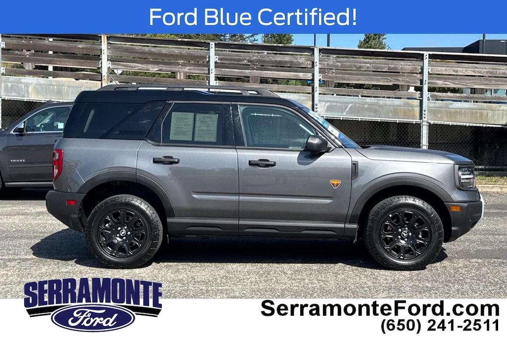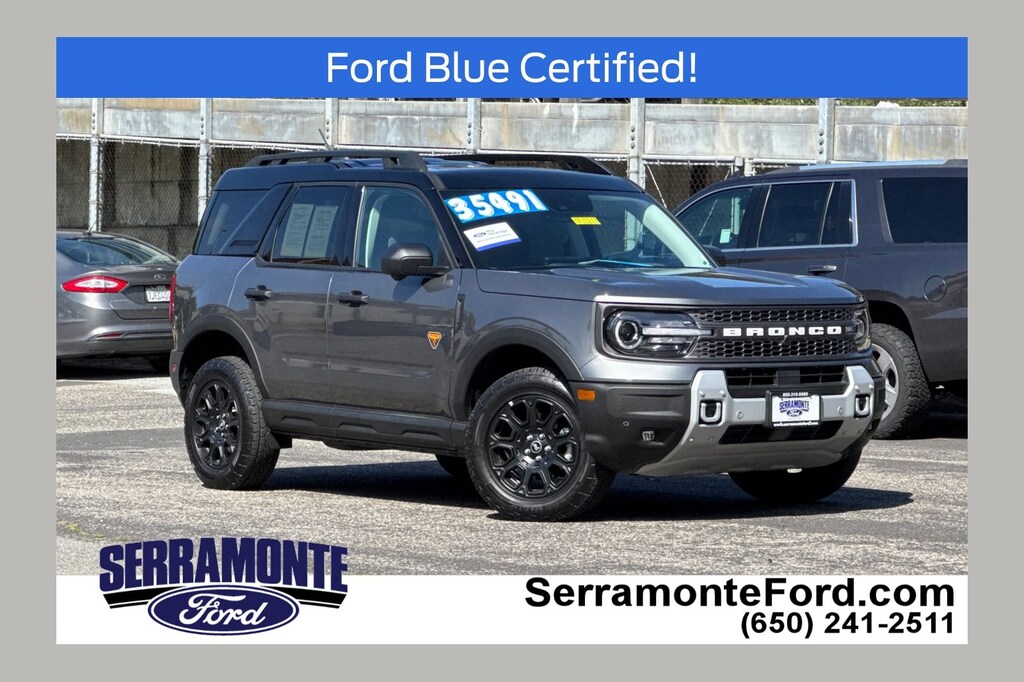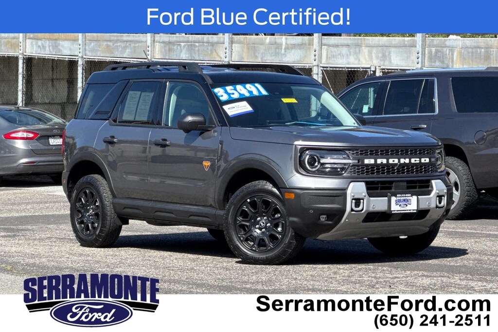 Recent Arrival! Certified. Clean CARFAX. ***BALANCE OF FACTORY WARRANTY***, ***BACKUP CAMERA & BLUETOOTH***, ***ADAPTIVE CRUISE CONTROL W/STOP & GO***, ***POWER LOCKS, WINDOWS, MIRRORS***, ***BLIND SPOT MONITOR***, ***APPLE CARPLAY & ANDROID AUTO***, ***CLEAN CARFAX***, ***360 DEGREE CAMERA***, ***FRONT AND REAR SENSING SYS. W/REAR BRAKING ASSIST**, ***HEATED LEATHER SEATS***, ***13.2" TOUCHSCREEN NAVIGATION SYS.-1YEAR SUBSC. ***, ***POWER FRONT SEATS***, ***SIRIUSXM***, **110V/400W OUTLET**, **HEADLAMPS-AUTO LED AUTO HIGH BEAMS W/SIGNATURE LED LIGHTING**, **LANE CENTERING SYS.**, **EVASIVE STEERING ASSIST**, Bronco Sport Badlands, EcoBoost 2.0L I4 GTDi DOHC Turbocharged VCT, 4WD, Dark Space Gray w/Leather Trimmed Front Bucket Seats. CARFAX One-Owner. 21/27 City/Highway MPG Carbonized Gray Metallic 2025 Ford Bronco Sport Badlands 4WD 8-Speed Automatic EcoBoost 2.0L I4 GTDi DOHC Turbocharged VCT